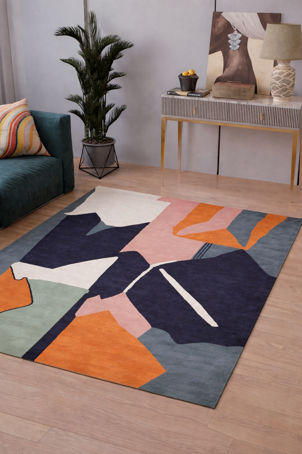 Das Design besticht durch seine vielschichtige, abstrakte Komposition: organische Flächen, klare Konturen und dynamische Linien verschmelzen zu einer harmonischen Gesamtstruktur, die jedem Raum eine besondere Tiefe verleiht. Diese kunstvolle Gestaltung wirkt gleichzeitig modern, ausdrucksstark und stilvoll – ideal für Wohnbereiche, die bewusst ein hochwertiges, designorientiertes Statement setzen möchten.