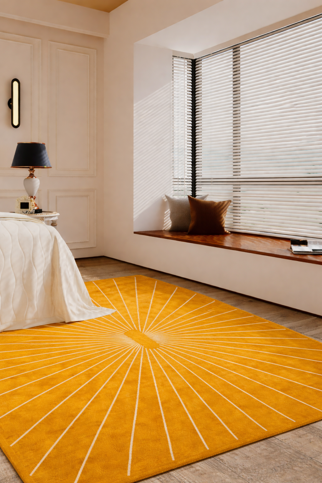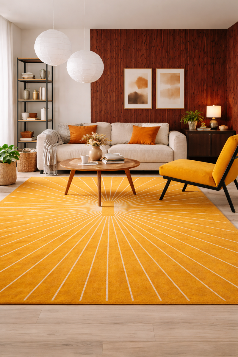 Das Design von WarmEmbrace ist von einer kraftvollen, aber zugleich harmonischen Linienführung geprägt. Ausgehend von einem zentralen Element entfalten sich fein angeordnete Strahlen, die sich über die gesamte Teppichfläche erstrecken. Diese klaren, rhythmischen Linien erzeugen eine visuelle Tiefe und verleihen dem Teppich eine moderne, architektonische Wirkung – elegant, ruhig und zugleich ausdrucksstark.