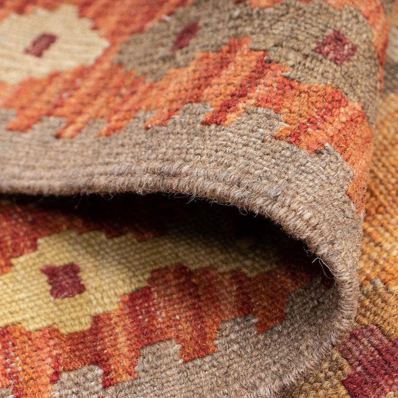 Dieser kunstvolle Kelim - Splash besticht das Auge mit seinen angesagten Farben. So bringt er eine moderne und harmonische Eleganz in Ihr Wohnambiente mit ein. Kelim Teppiche sind im Gegensatz zu klassischen Orientteppichen in traditioneller Art handgewebt statt geknüpft. In anderen Ländern werden diese Exemplare auch als Kissen oder Vorhänge genutzt. Diese Teppiche haben einen dünnen Flor, für das feste Obergewebe wird 100% Schurwolle verwendet, welche von Natur aus äußerst pflegeleicht und strapazierbar ist. Als echten Kelim bezeichnen Experten nur Teppiche, welche in der Türkei, dem Kaukasusgebiet, Persien, Afghanistan und Turkmenien hergestellt wurden. Echte Teppiche aus dem Orient eben.