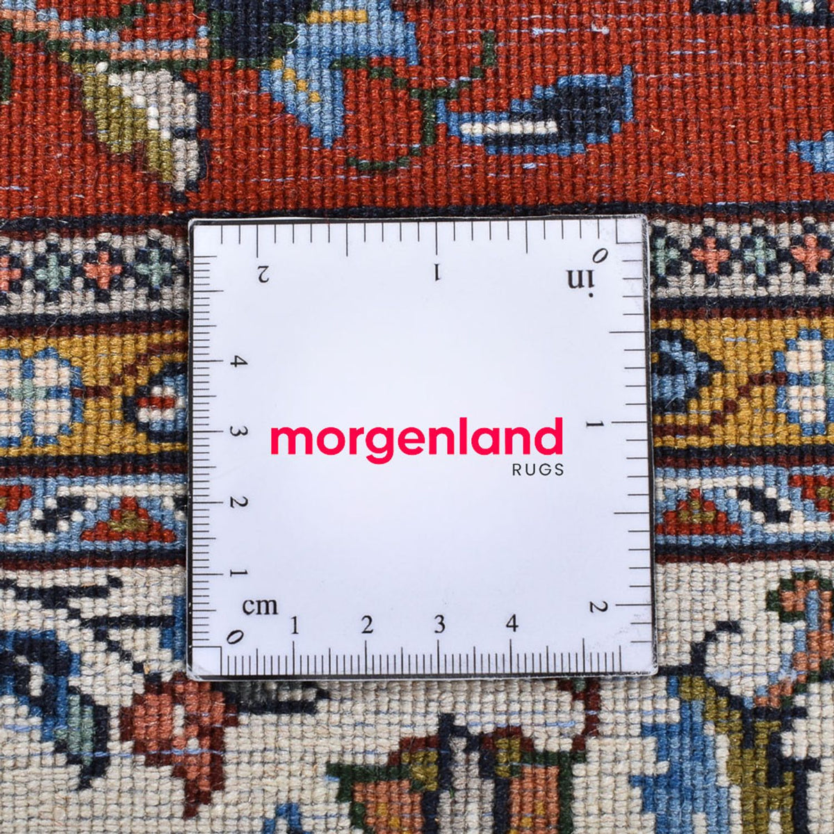 Sarough gehört zu den wichtigsten Teppich-Provenienzen des Iran. Der Sarough verbindet modernes Wohnen mit traditioneller Knüpfkunst. Durch seine robuste Knüpfung ist der Sarough ein strapazierfähiger Teppich mit hoher Schall- und Wärmeisolierung. Die verwendete Wolle hat eine hohe Qualität, ist glänzend und die Teppiche sind robust und strapazierfähig. Die Knüpfungen sind sehr fein und der Flor relativ hoch. Sein zeitloses Design fügt sich problemlos in die Umgebung ein und verleiht ihr ein behagliches Wohngefühl. Heute werden in Sarough Teppiche verschiedenster Qualitäten geknüpft. Die Mustervielfalt der Teppiche gehört zu den reichhaltigsten und traditionellsten des ganzen Orients und kann somit nicht verallgemeinert werden. Bekannt sind sie für Ihre wunderschönen Medaillons, sowie auch für das bekannte durchgemusterte Mir Muster.