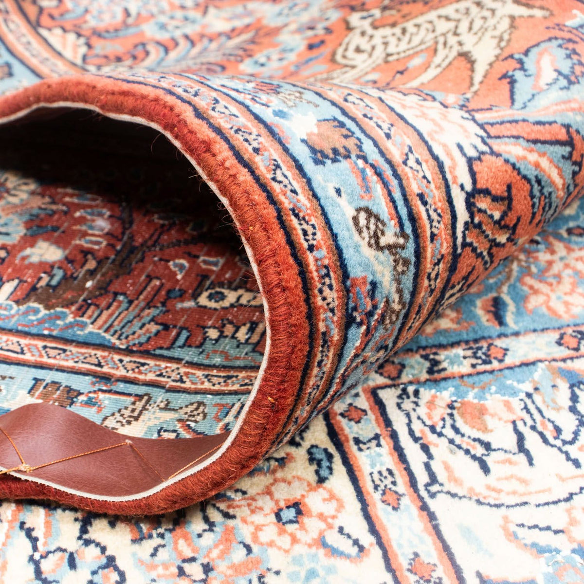 Der handgeknüpfte Teppich aus Moud, einer der größten Städte des Irans, ist ein echtes Kunstwerk. Er wurde aus reiner Naturwolle gefertigt und von erfahrenen Handwerkern sorgfältig geknüpft. Diese hochwertigen Teppiche sind bekannt für ihre außergewöhnlichen Größen und ihre extrem hochwertige Wolle. Neben ihrer Schönheit sind Moud-Teppiche auch äußerst pflegeleicht. Sie können einfach mit einem Staubsauger oder einem Besen gereinigt werden, um Schmutz und Staub zu entfernen. Wenn nötig, kann der Teppich auch mit einem milden Reinigungsmittel und Wasser gereinigt werden. Aufgrund ihrer hohen Qualität und ihrer langlebigen Natur sind Moud-Teppiche eine ausgezeichnete Investition für jeden Teppichliebhaber. Sie sind nicht nur eine schöne Ergänzung für jedes Zuhause, sondern auch eine pflegeleichte und praktische Wahl. Egal, ob Sie sich für einen klassischen oder einen modernen Stil entscheiden, ein Moud-Teppich wird Ihrem Zuhause eine unvergleichliche Eleganz und Stil verleihen.