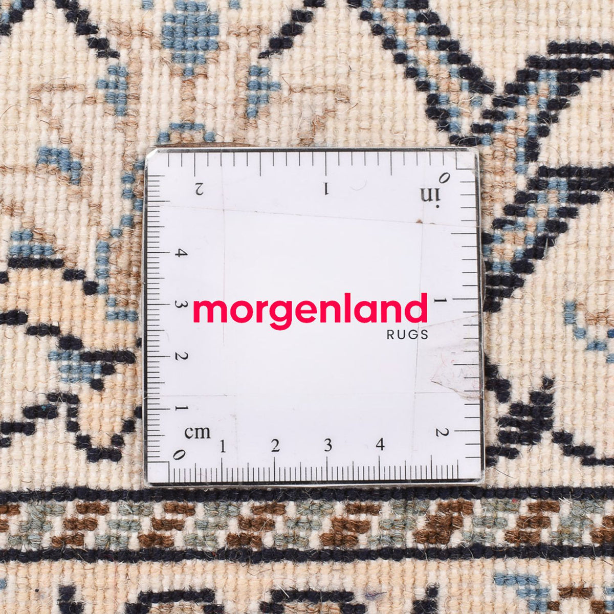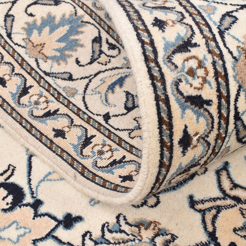 Nain Teppiche werden in hervorragender Feinheit geknüpft. Als Flormaterial wird meist beste, samtartige Korkwolle und immer Seide verwendet, damit eine exakte Musterung von Medaillons und All-Over-Musterung ausgeführt werden kann. Man unterscheidet den Nain in 4 Qualitätsstufen, die in „La“ angegeben werden. 4La, 6La, 9La, 12La. Dies ist eine Qualitätsbezeichnung und bezieht sich auf die Anzahl der Faden Schichten, die in jedem Kettfäden enthalten sind. Je geringerer die angegebene Zahl ist, desto höher die Knotendichte, desto feiner und dichter ist der Teppich. Nains gehören zu den Schönsten auf der Welt. Sie sind auch bei Sammlern sehr beliebt. Durch ihre schlichte Eleganz passen Nains auch in moderne Einrichtungen und bringen Luxus ins Haus.