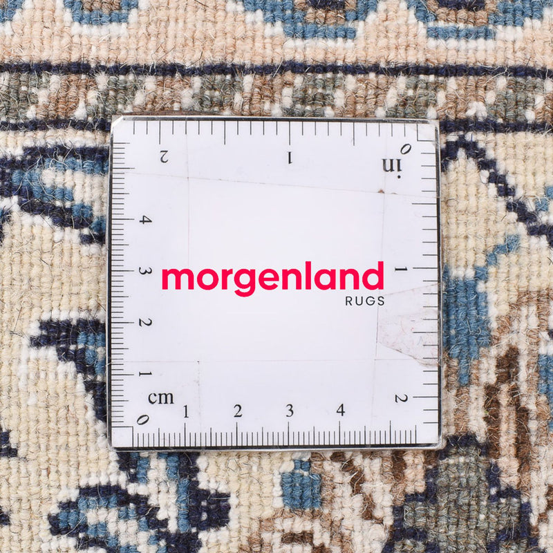Nain Teppiche werden in hervorragender Feinheit geknüpft. Als Flormaterial wird meist beste, samtartige Korkwolle und immer Seide verwendet, damit eine exakte Musterung von Medaillons und All-Over-Musterung ausgeführt werden kann. Man unterscheidet den Nain in 4 Qualitätsstufen, die in „La“ angegeben werden. 4La, 6La, 9La, 12La. Dies ist eine Qualitätsbezeichnung und bezieht sich auf die Anzahl der Faden Schichten, die in jedem Kettfäden enthalten sind. Je geringerer die angegebene Zahl ist, desto höher die Knotendichte, desto feiner und dichter ist der Teppich. Nains gehören zu den Schönsten auf der Welt. Sie sind auch bei Sammlern sehr beliebt. Durch ihre schlichte Eleganz passen Nains auch in moderne Einrichtungen und bringen Luxus ins Haus.