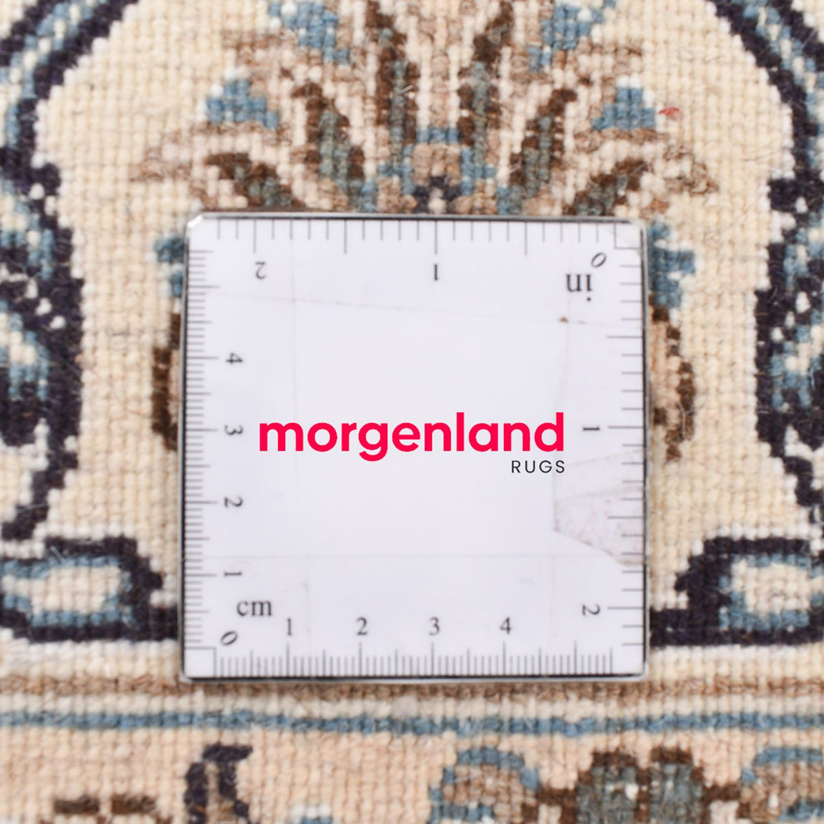 Nain Teppiche werden in hervorragender Feinheit geknüpft. Als Flormaterial wird meist beste, samtartige Korkwolle und immer Seide verwendet, damit eine exakte Musterung von Medaillons und All-Over-Musterung ausgeführt werden kann. Man unterscheidet den Nain in 4 Qualitätsstufen, die in „La“ angegeben werden. 4La, 6La, 9La, 12La. Dies ist eine Qualitätsbezeichnung und bezieht sich auf die Anzahl der Faden Schichten, die in jedem Kettfäden enthalten sind. Je geringerer die angegebene Zahl ist, desto höher die Knotendichte, desto feiner und dichter ist der Teppich. Nains gehören zu den Schönsten auf der Welt. Sie sind auch bei Sammlern sehr beliebt. Durch ihre schlichte Eleganz passen Nains auch in moderne Einrichtungen und bringen Luxus ins Haus.