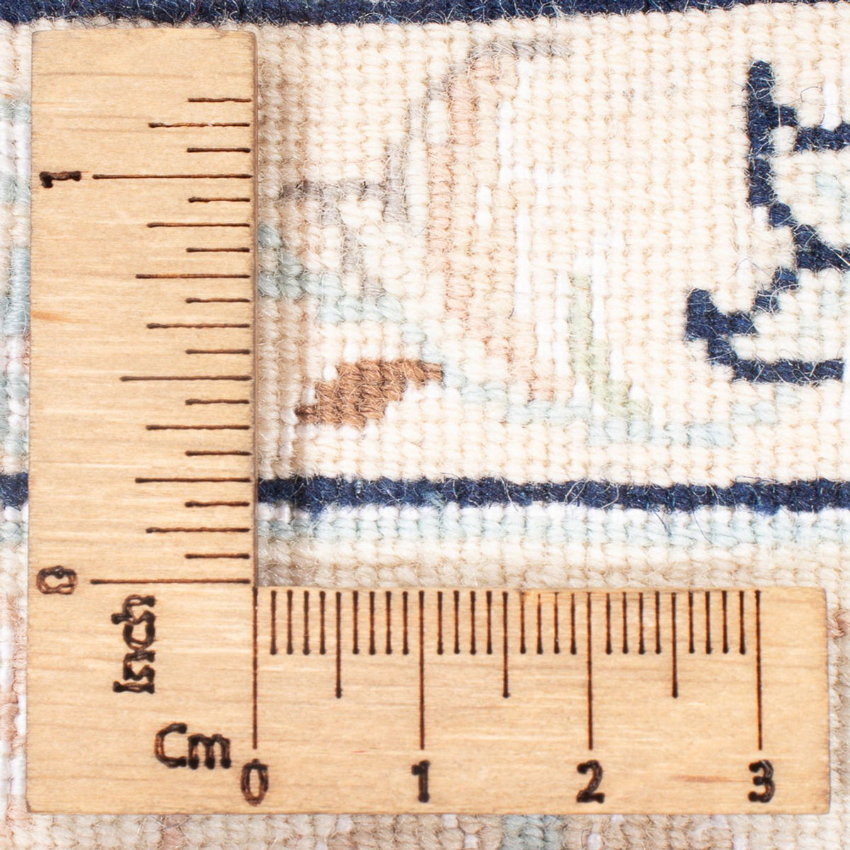 Dieser schöne und selten fein geknüpfte Perserteppich – Nain – Premium gehört zur höchsten Qualitätsstufe 4 mit circa 890.000 bis 1.000.000 Knoten pro Quadratmeter. Dem feinen Nain 6La, ist der Ruhm der Provenienz zu verdanken. Er gilt im gesamten Orient als besonders hochwertiger persischer Teppich. Nain Teppiche werden in hervorragender Feinheit geknüpft. Als Flormaterial wird meist beste, samtartige Korkwolle und immer Seide verwendet, damit eine exakte Musterung von Medaillons und All Over-Musterung ausgeführt werden kann. Man unterscheidet den Nain in 4 Qualitätsstufen, die in „La“ angegeben werden. 4La, 6La, 9La, 12La. Dies ist eine Qualitätsbezeichnung und bezieht sich auf die Anzahl der Fadenschichten, die in jedem Kettenfaden enthalten sind. Je geringerer die angegebene Zahl ist, desto feiner und dichter ist der Teppich. Nains gehören zu den Schönsten auf der Welt. Sie sind bei Sammlern sehr beliebt. Durch ihre schlichte Eleganz passen Nains auch in moderne Einrichtungen.
