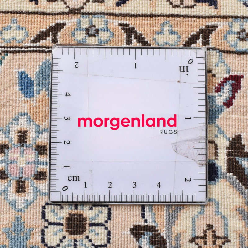 Dieser schöne und selten fein geknüpfte Perserteppich – Nain – Premium gehört zur höchsten Qualitätsstufe 4 mit circa 890.000 bis 1.000.000 Knoten pro Quadratmeter. Dem feinen Nain 6La, ist der Ruhm der Provenienz zu verdanken. Er gilt im gesamten Orient als besonders hochwertiger persischer Teppich. Nain Teppiche werden in hervorragender Feinheit geknüpft. Als Flormaterial wird meist beste, samtartige Korkwolle und immer Seide verwendet, damit eine exakte Musterung von Medaillons und All Over-Musterung ausgeführt werden kann. Man unterscheidet den Nain in 4 Qualitätsstufen, die in „La“ angegeben werden. 4La, 6La, 9La, 12La. Dies ist eine Qualitätsbezeichnung und bezieht sich auf die Anzahl der Fadenschichten, die in jedem Kettenfaden enthalten sind. Je geringerer die angegebene Zahl ist, desto feiner und dichter ist der Teppich. Nains gehören zu den Schönsten auf der Welt. Sie sind bei Sammlern sehr beliebt. Durch ihre schlichte Eleganz passen Nains auch in moderne Einrichtungen.