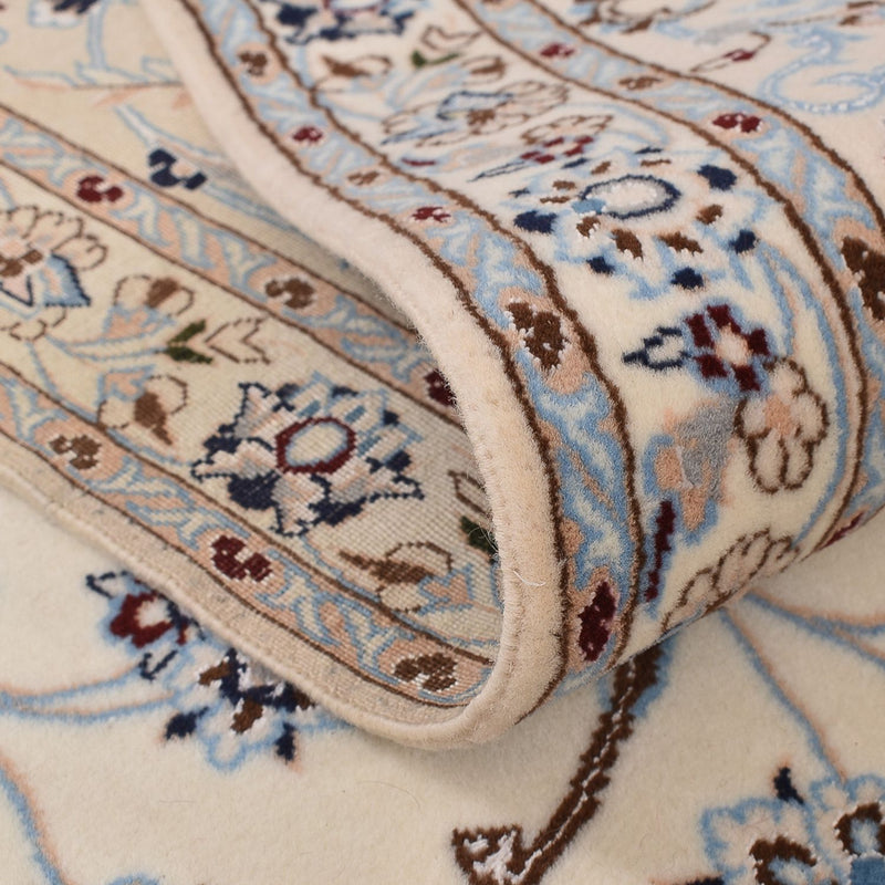 Dieser schöne und selten fein geknüpfte Perserteppich – Nain – Premium gehört zur höchsten Qualitätsstufe 4 mit circa 890.000 bis 1.000.000 Knoten pro Quadratmeter. Dem feinen Nain 6La, ist der Ruhm der Provenienz zu verdanken. Er gilt im gesamten Orient als besonders hochwertiger persischer Teppich. Nain Teppiche werden in hervorragender Feinheit geknüpft. Als Flormaterial wird meist beste, samtartige Korkwolle und immer Seide verwendet, damit eine exakte Musterung von Medaillons und All Over-Musterung ausgeführt werden kann. Man unterscheidet den Nain in 4 Qualitätsstufen, die in „La“ angegeben werden. 4La, 6La, 9La, 12La. Dies ist eine Qualitätsbezeichnung und bezieht sich auf die Anzahl der Fadenschichten, die in jedem Kettenfaden enthalten sind. Je geringerer die angegebene Zahl ist, desto feiner und dichter ist der Teppich. Nains gehören zu den Schönsten auf der Welt. Sie sind bei Sammlern sehr beliebt. Durch ihre schlichte Eleganz passen Nains auch in moderne Einrichtungen.