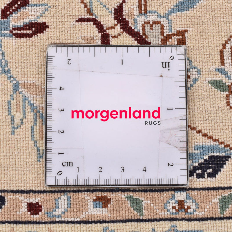 Dieser schöne und selten fein geknüpfte Perserteppich – Nain – Premium gehört zur höchsten Qualitätsstufe 4 mit circa 890.000 bis 1.000.000 Knoten pro Quadratmeter. Dem feinen Nain 6La, ist der Ruhm der Provenienz zu verdanken. Er gilt im gesamten Orient als besonders hochwertiger persischer Teppich. Nain Teppiche werden in hervorragender Feinheit geknüpft. Als Flormaterial wird meist beste, samtartige Korkwolle und immer Seide verwendet, damit eine exakte Musterung von Medaillons und All Over-Musterung ausgeführt werden kann. Man unterscheidet den Nain in 4 Qualitätsstufen, die in „La“ angegeben werden. 4La, 6La, 9La, 12La. Dies ist eine Qualitätsbezeichnung und bezieht sich auf die Anzahl der Fadenschichten, die in jedem Kettenfaden enthalten sind. Je geringerer die angegebene Zahl ist, desto feiner und dichter ist der Teppich. Nains gehören zu den Schönsten auf der Welt. Sie sind bei Sammlern sehr beliebt. Durch ihre schlichte Eleganz passen Nains auch in moderne Einrichtungen.