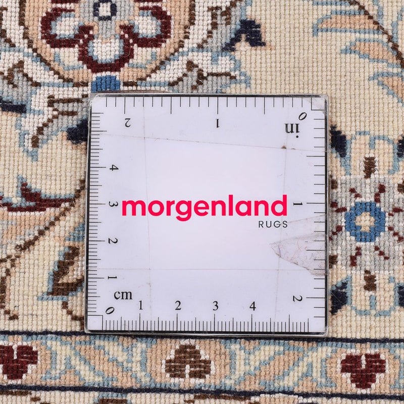 Dieser schöne und selten fein geknüpfte Perserteppich – Nain – Premium gehört zur höchsten Qualitätsstufe 4 mit circa 890.000 bis 1.000.000 Knoten pro Quadratmeter. Dem feinen Nain 6La, ist der Ruhm der Provenienz zu verdanken. Er gilt im gesamten Orient als besonders hochwertiger persischer Teppich. Nain Teppiche werden in hervorragender Feinheit geknüpft. Als Flormaterial wird meist beste, samtartige Korkwolle und immer Seide verwendet, damit eine exakte Musterung von Medaillons und All Over-Musterung ausgeführt werden kann. Man unterscheidet den Nain in 4 Qualitätsstufen, die in „La“ angegeben werden. 4La, 6La, 9La, 12La. Dies ist eine Qualitätsbezeichnung und bezieht sich auf die Anzahl der Fadenschichten, die in jedem Kettenfaden enthalten sind. Je geringerer die angegebene Zahl ist, desto feiner und dichter ist der Teppich. Nains gehören zu den Schönsten auf der Welt. Sie sind bei Sammlern sehr beliebt. Durch ihre schlichte Eleganz passen Nains auch in moderne Einrichtungen.