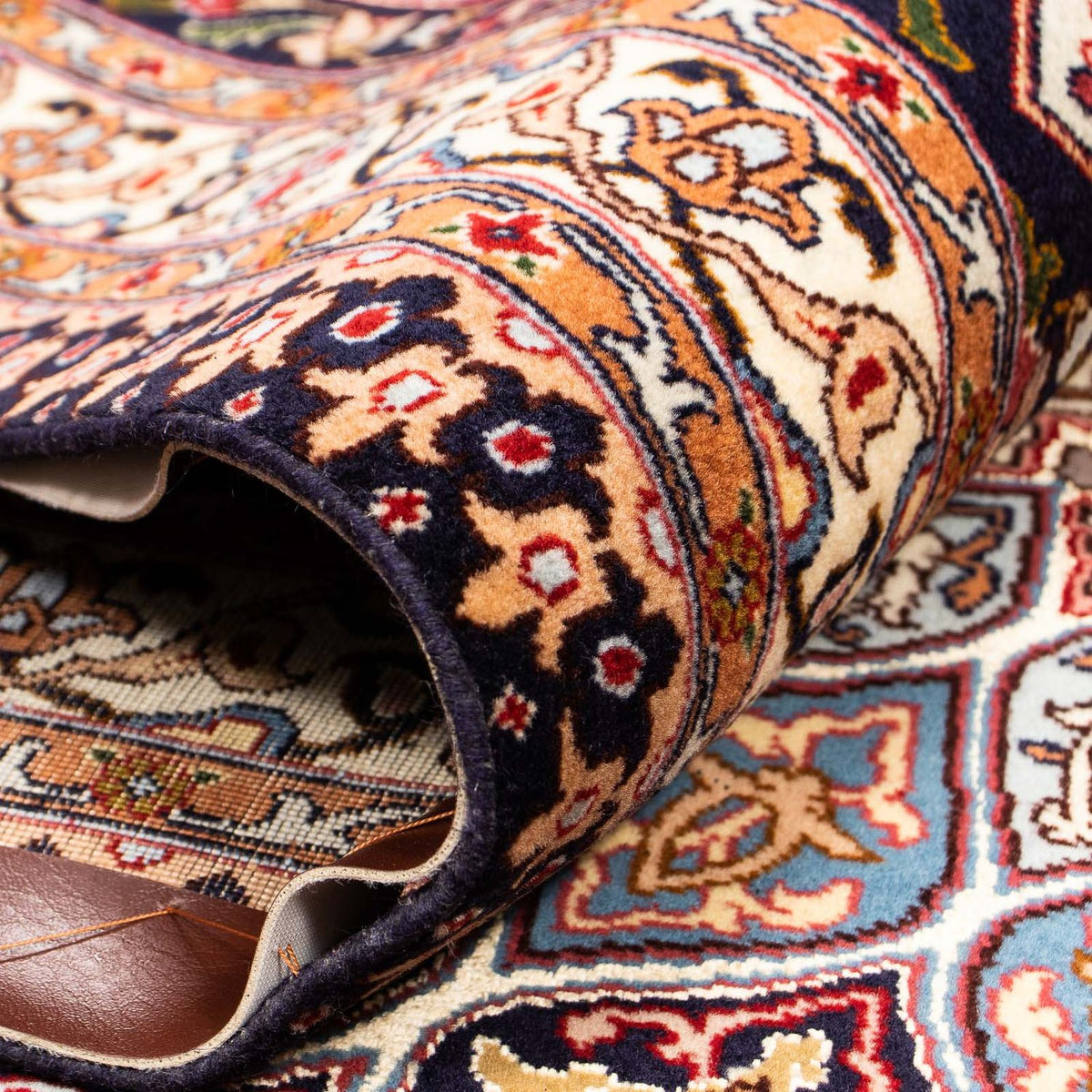 Dieser fein geknüpfte Perserteppich - Täbriz – Royal ist mit hochwertiger Korkwolle, in sorgfältiger und fehlerfreier Handarbeit gefertigt. Der Täbriz 40 Raj gehört zu den schönsten seiner Klasse. Diese Teppiche begründeten den guten Ruf der persischen Knüpfkunst. Er ist ein sehr beliebter Teppich aus einem der besten Knüpfgebiete Persiens. Sie haben oft ein großes, zentral platziertes Medaillon aus schönen Blumenmotiven, ein typisch orientalisches Motiv. Täbriz-Teppiche haben häufig die zusätzliche Bezeichnung Raj. Man unterscheidet zwischen 40, 50, 60, 70, 80 Raj. Je höher die angegebene Zahl ist, desto feiner und dichter ist der Teppich geknüpft. Raj ist eine Qualitätsbezeichnung und bezieht sich auf die Anzahl der Knoten auf einer Breite von ca. 70 mm. Aufgrund der dichten Knüpfung ist der Teppich strapazierfähig, unempfindlich und auch für extreme Benutzung gut geeignet. Klassische Eleganz und Farb-Opulenz zeichnen diesen edlen Teppich aus.
